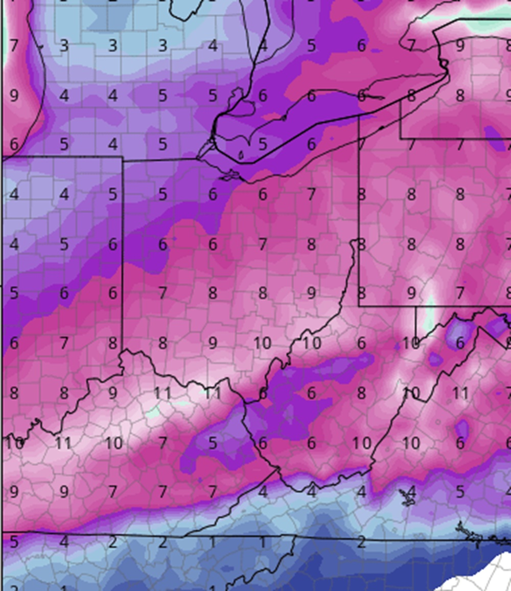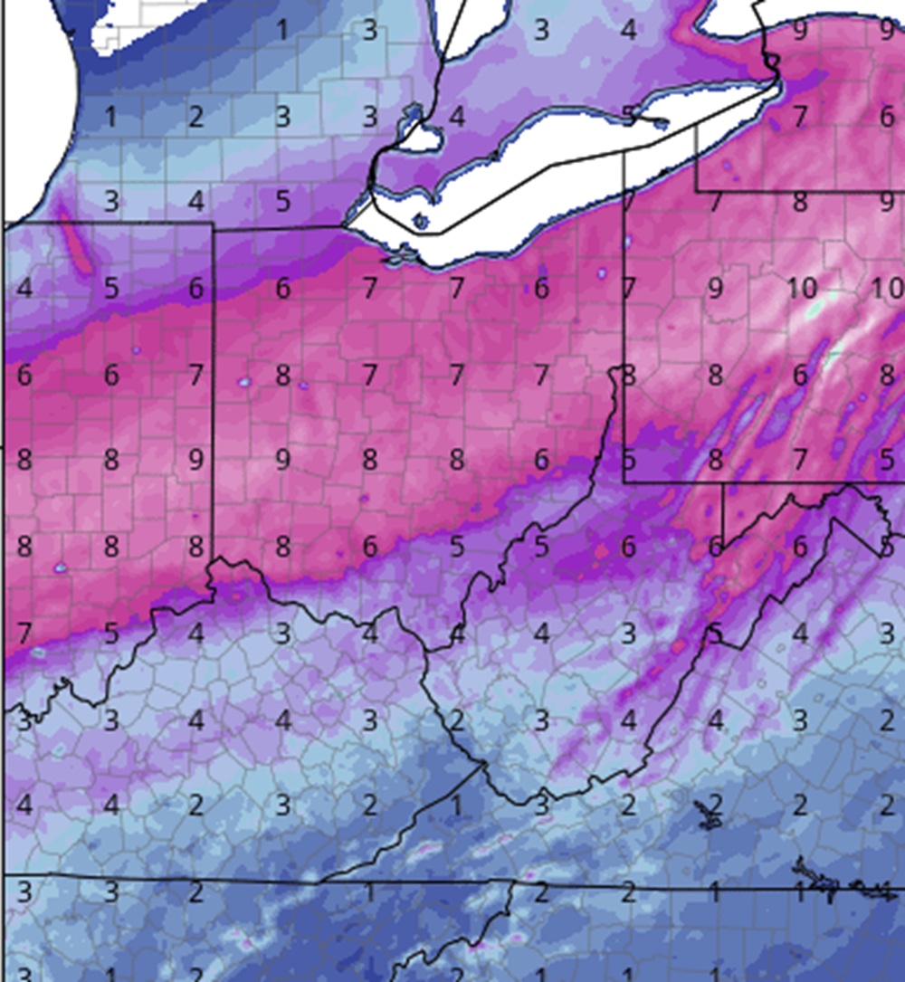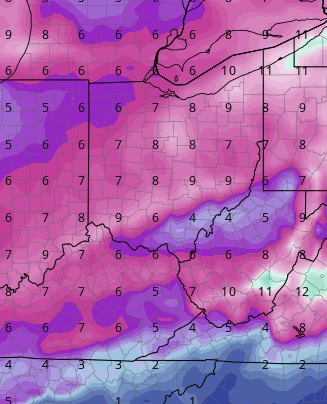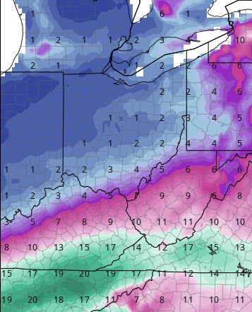 6Z NAM- 8″-10″ (10-1 Ratio)- NAM has been further north than most other models, and it brings the mixing line further into Ohio but still well south of Columbus. With true ratios, this would be 10″-13″.