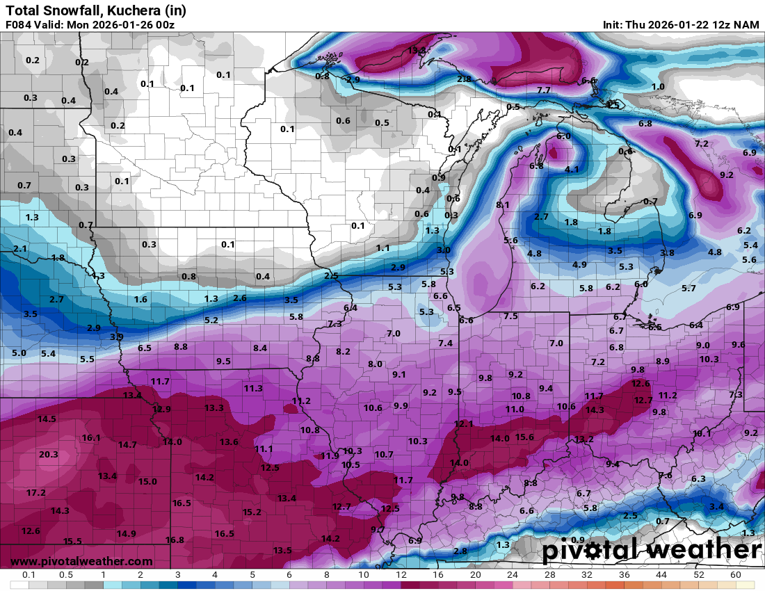 Final Update as of 9:24AM, 1/26/2026: Well, after all the model runs and predictions, the storm did indeed not only happen, but was a historic event for Central Ohio. A general 10″-15″ occurred in most areas. The 11.9″ at John Glenn International yesterday broke the daily snowfall record for the date, beating the old record of 4.7″ set in 1988. It also tied for the 3rd highest one-day snowfall total for any date in history, after only March 8, 2008’s 15.5″ and April 4, 1987’s 12.3″. Additionally, the 12″ storm total for January 24th-25th, 2026 will go down as the 7th biggest snowstorm of all-time in Columbus.