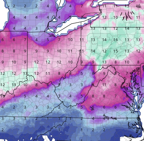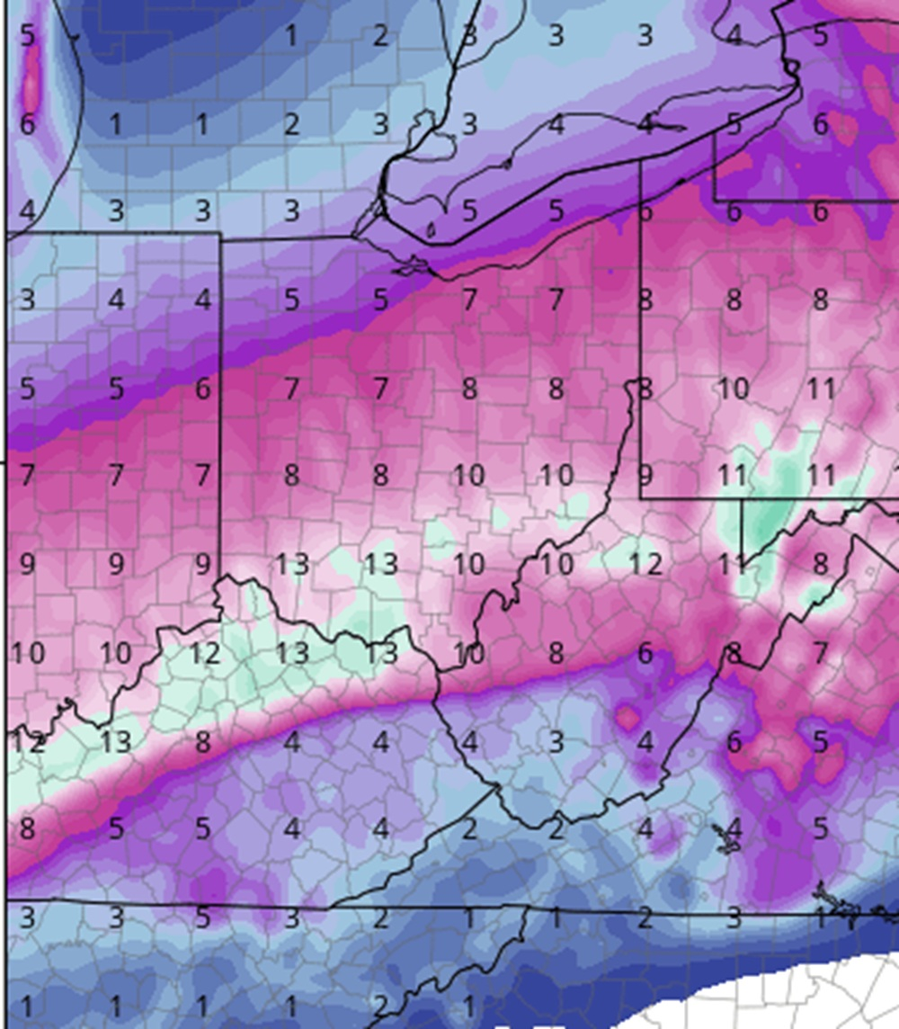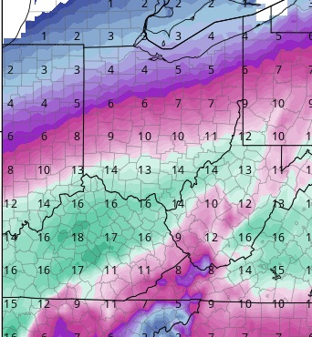 6Z GEM: 8″-10 (10-1 Ratio)- The RGEM is further south with the heaviest snows than NAM, but also has higher totals, even at 10-1, in Ohio. True ratios would be 10″-13″.