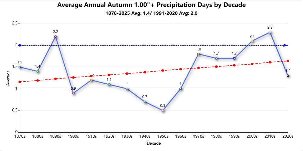 Top 10 Autumns with the Most 1″+ Snowfall Days
