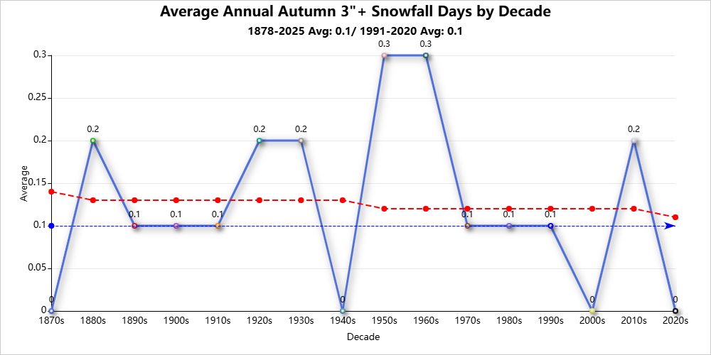 Top 10 Autumns with the Most 3″+ Snowfall Days
