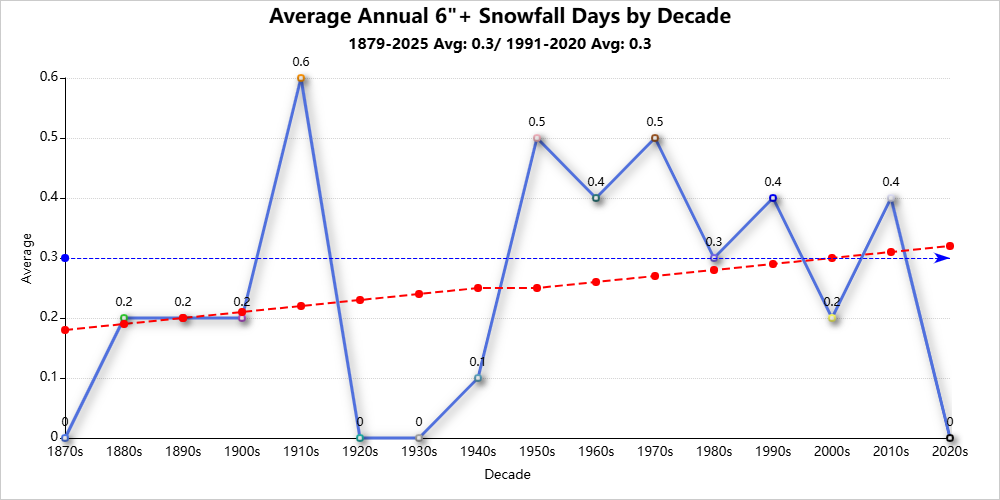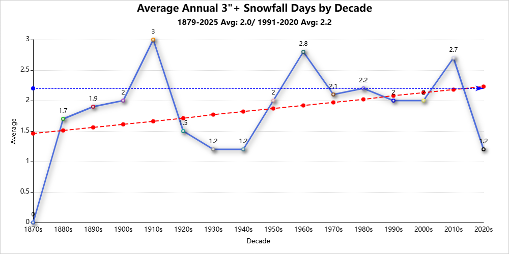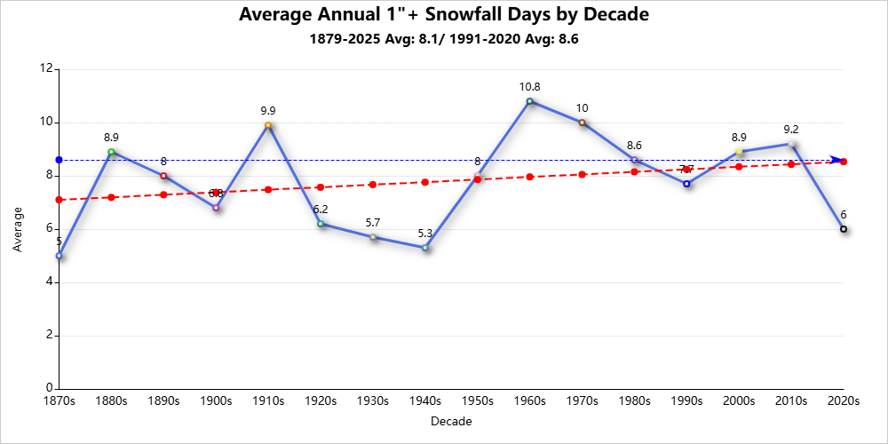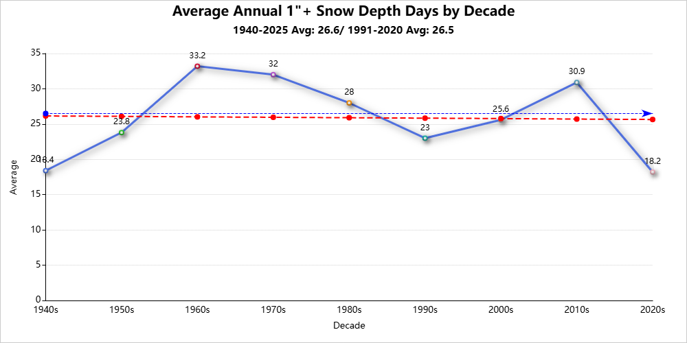Top 10 Years with the Most 1″+ Snow Depth Days