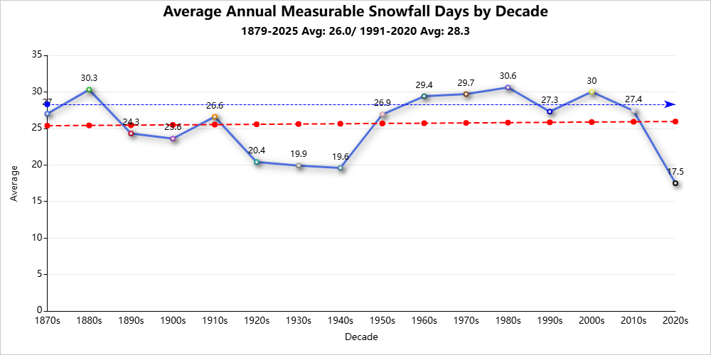 Top 10 Years with the Fewest 1″+ Snow Depth Days