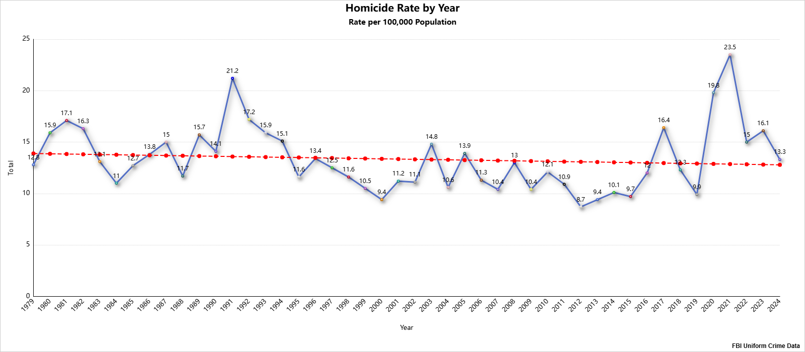 Homicides have not followed trends for most other crime types. There were two significant spikes in homicides since 1979. The first occurred 1990-1992 during the crack epidemic, and the second occurred 2020-2021 during the pandemic and its disruptions. This most recent spike, however, occurred during a consistently higher period of homicides that began in 2016. It’s unclear why homicides went up that year and have stayed generally higher since, but the transition was abrupt.
