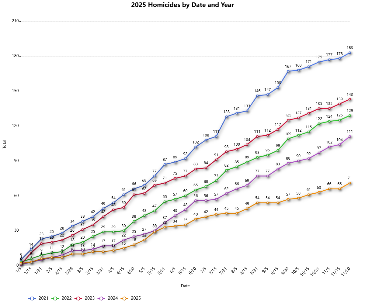 8 homicides occurred in November, 2025, pushing the annual total up to 71. 2025 to date is the lowest since 2012, and the 3rd lowest since 2000. However, because of population changes, the 2025 homicide rate per population is the lowest since at least 1978.