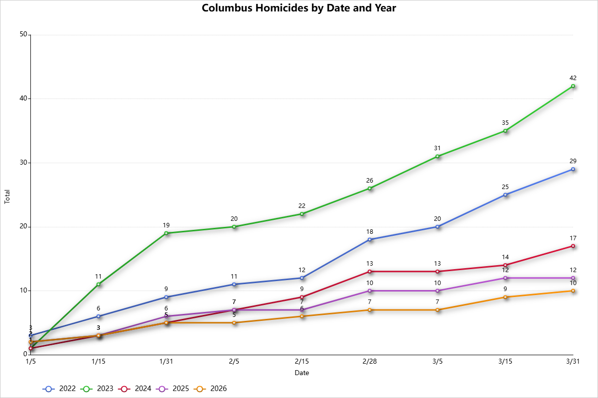 Through April 4th, there have been just 10 homicides in Columbus. This is the lowest total for the first 3 months of the year since at least 1985. 3 homicides occurred in March.