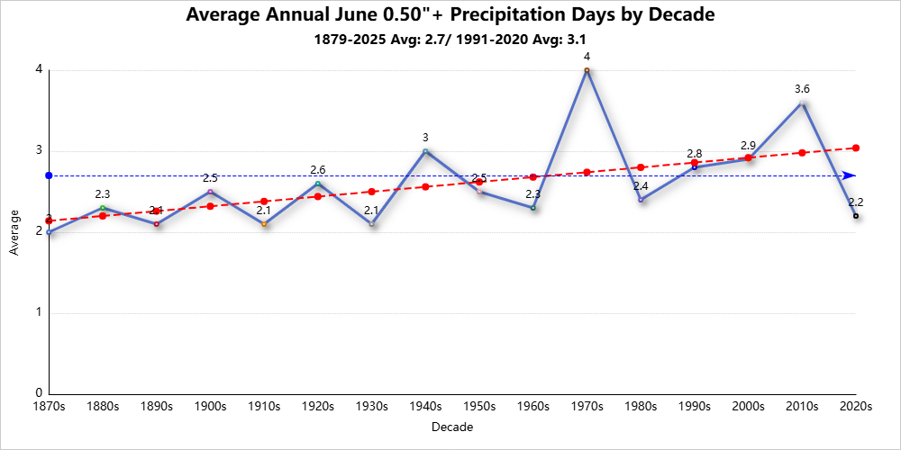 Top 5 Junes with the Most 0.50″+ Precipitation Days