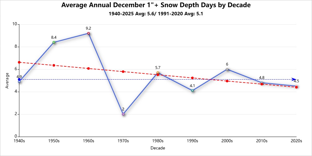 Top 5 Decembers with the Most 1″+ Snow Depth Days 1940-2025
