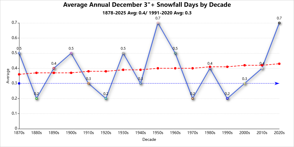 Top 5 Decembers with the Most 3″+ Snowfall Days
