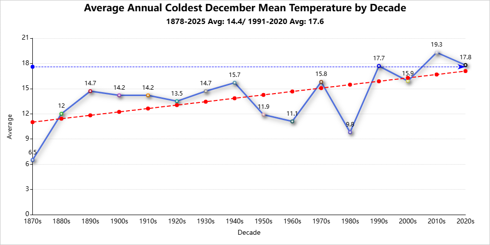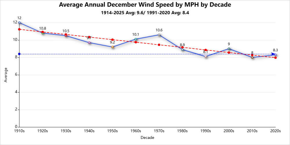 Top 5 Decembers with the Highest Average Wind Speed in MPH Since 1914