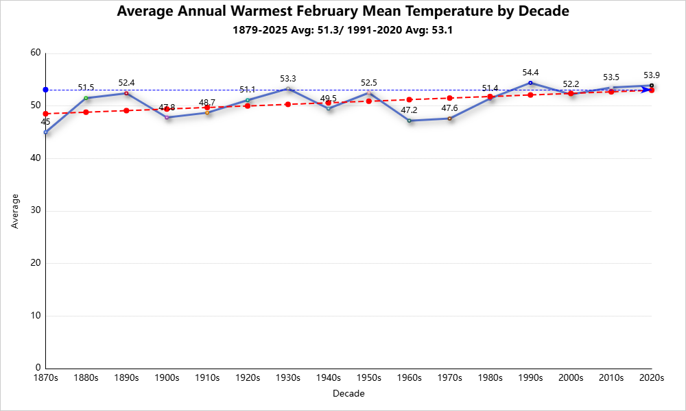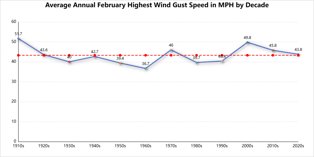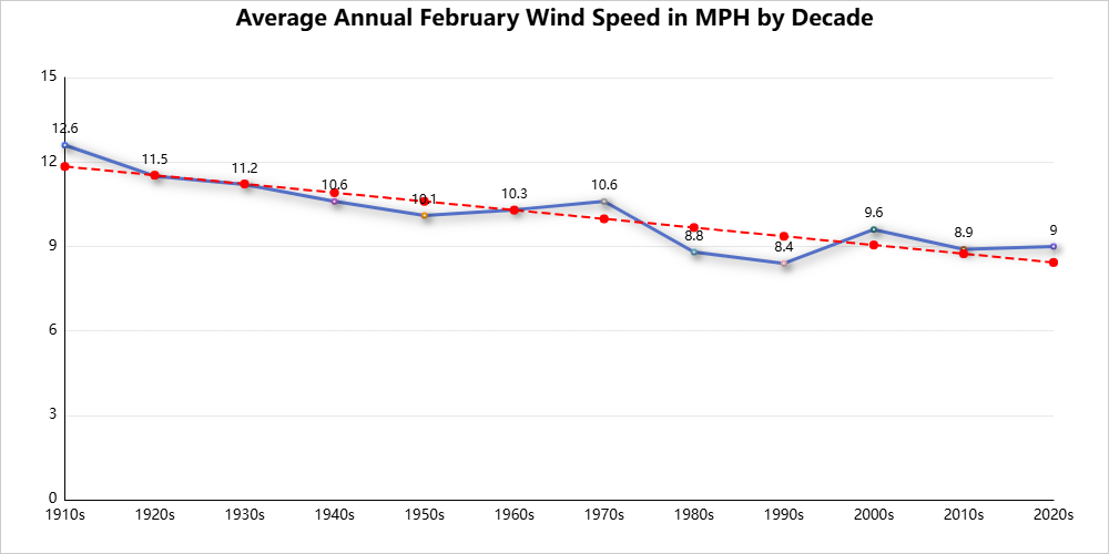 Top 5 Februaries with the Highest Average Wind Speed in MPH since 1914
