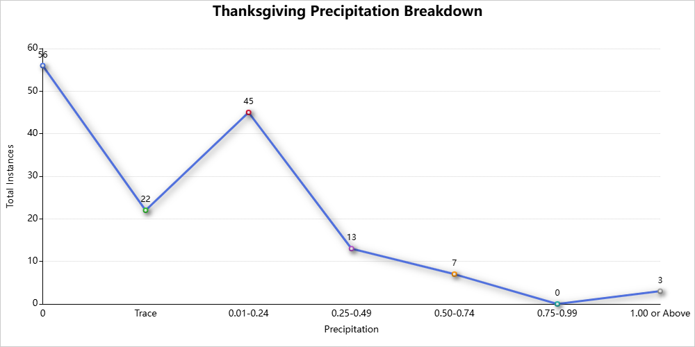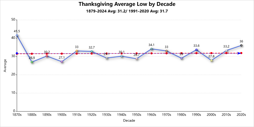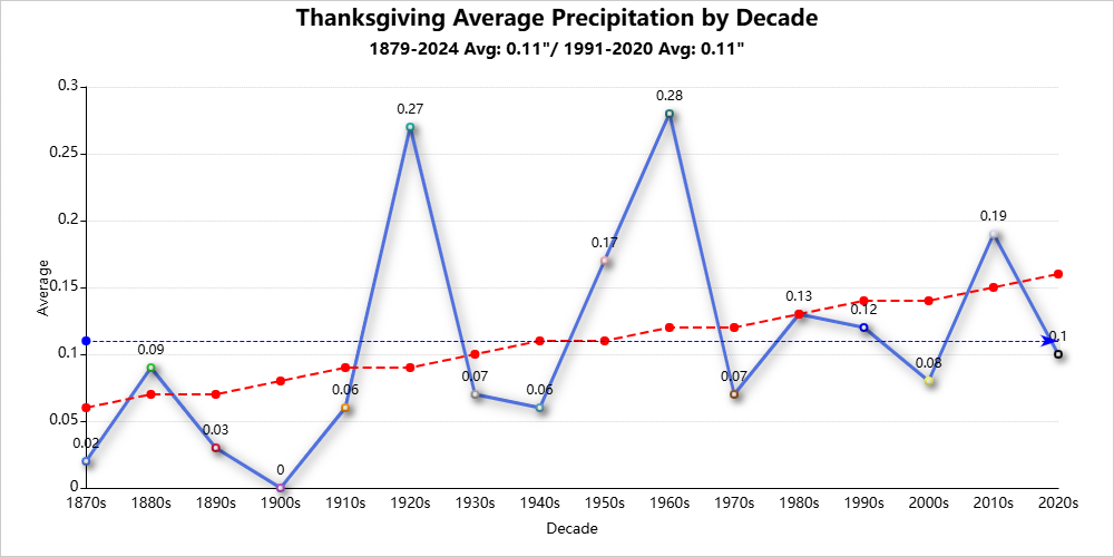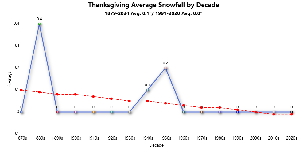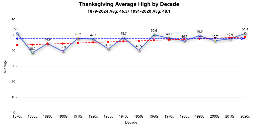 Thanksgiving weather is detailed here for 1878-2024.