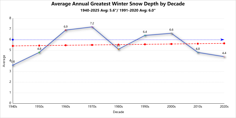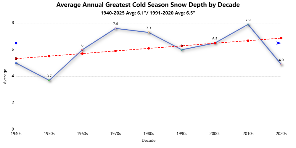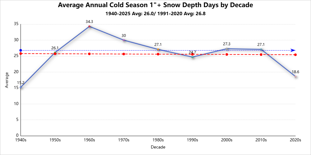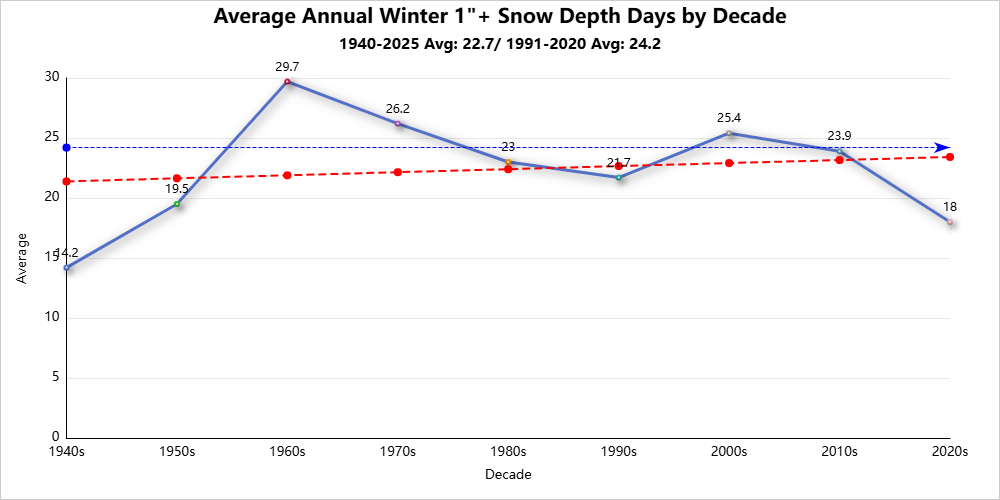 Top 10 Cold Seasons with the Most 1″+ Snow Depth Days- 1940-2024 Only