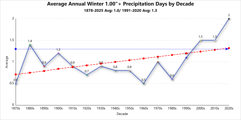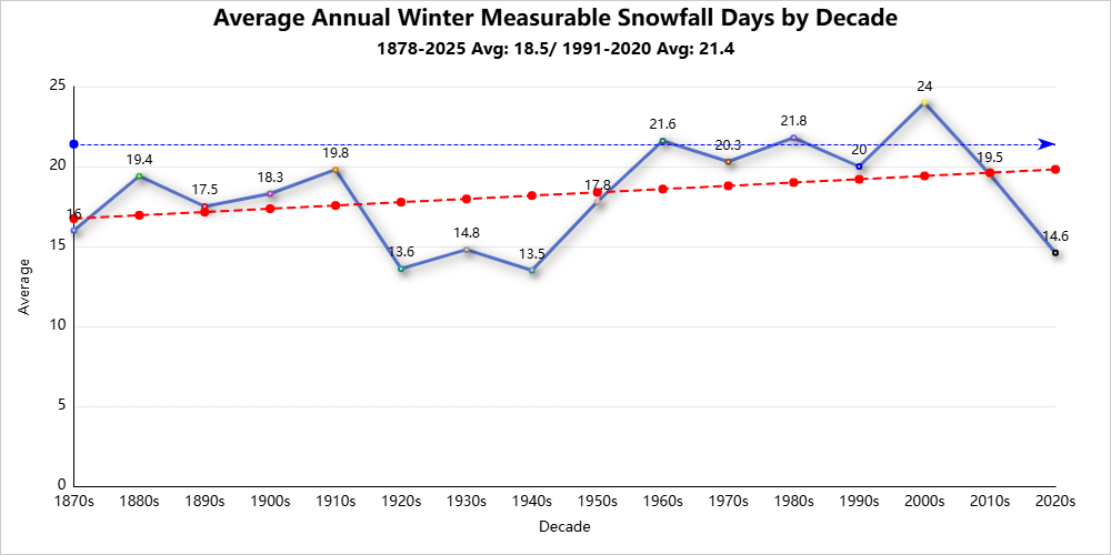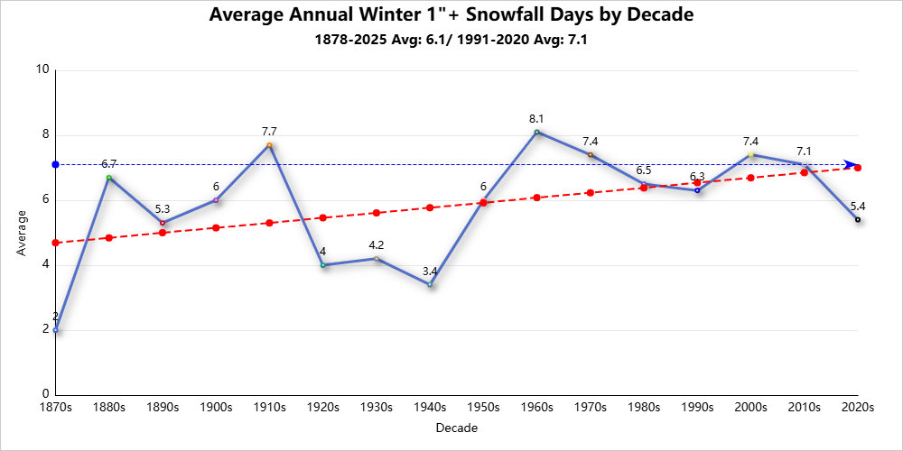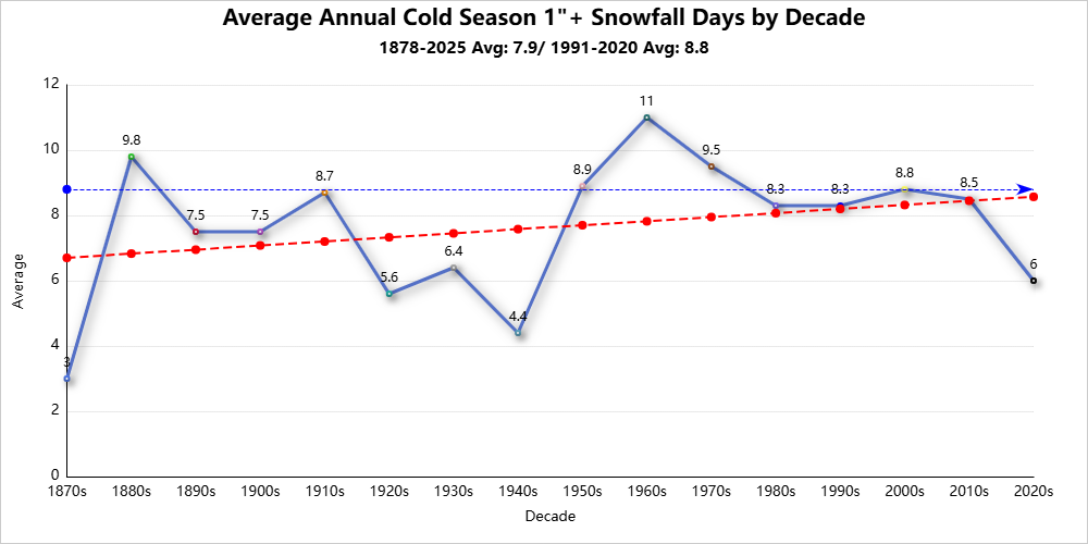 Top 10 Cold Seasons with the Most 1″+ Snowfall Days