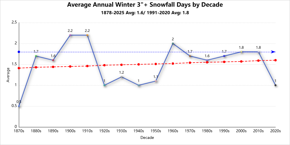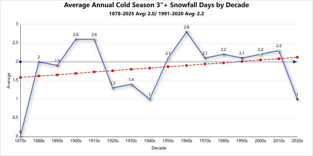 Top 10 Cold Seasons with the Most 3″+ Snowfall Days