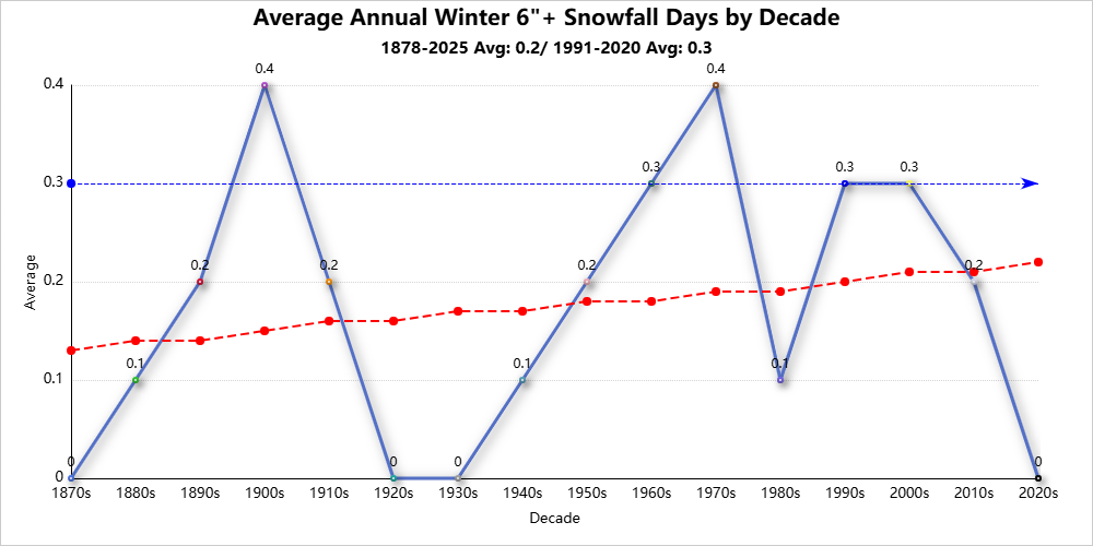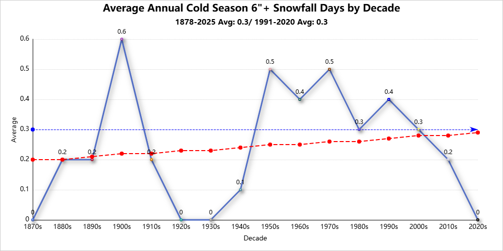 Top 10 Cold Seasons with the Most 6″+ Snowfall Days